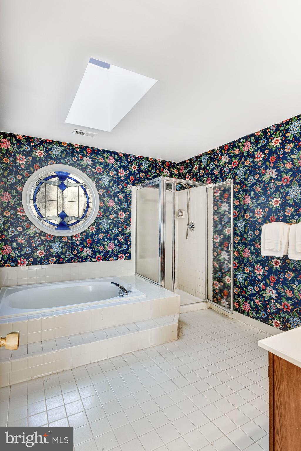 The upper level includes hardwood flooring throughout, a generous primary bedroom with walk-in closet and en-suite bath with skylight, and three additional spacious bedrooms. The primary and secondary upper-level baths are original, fully functional, and ready for replacement. A large loft/flex space completes the level.