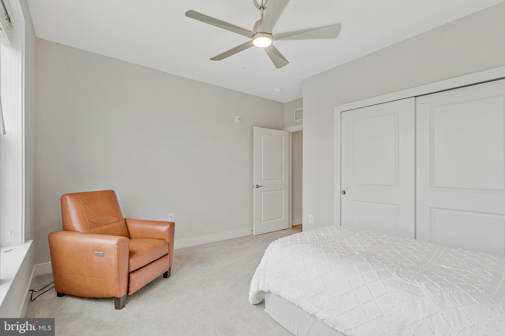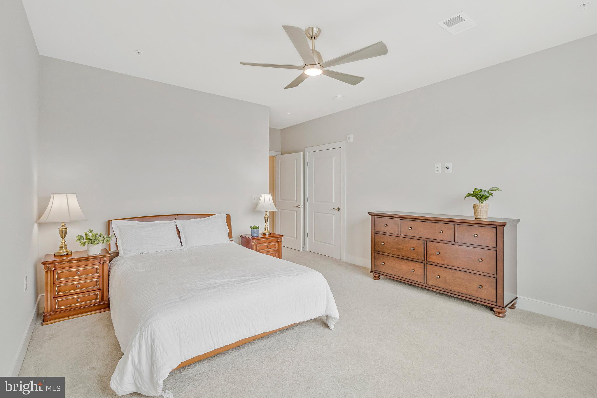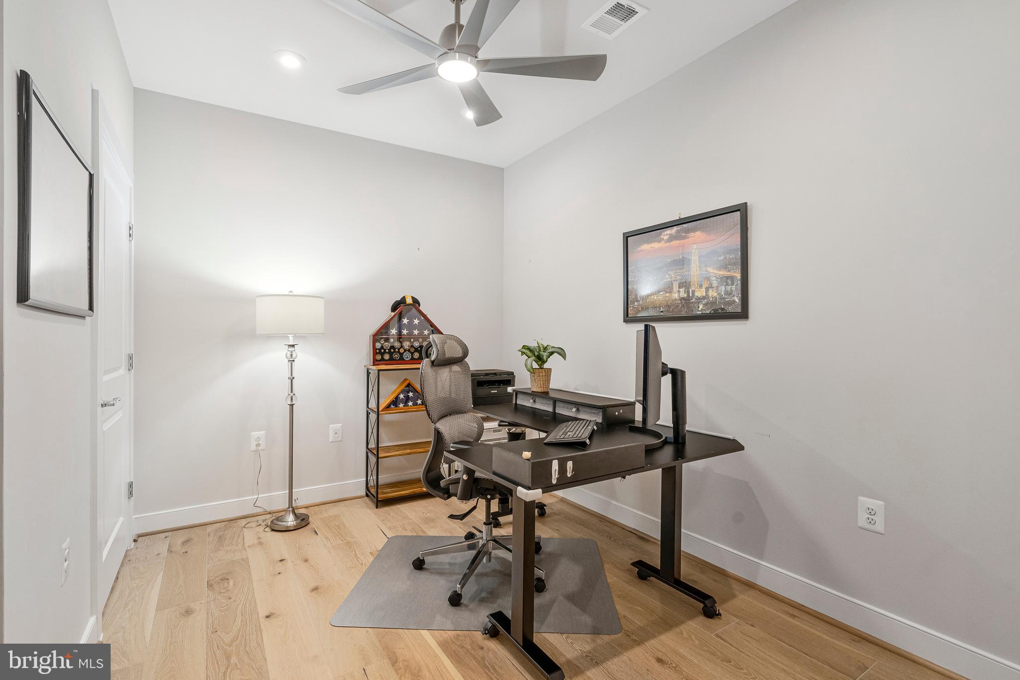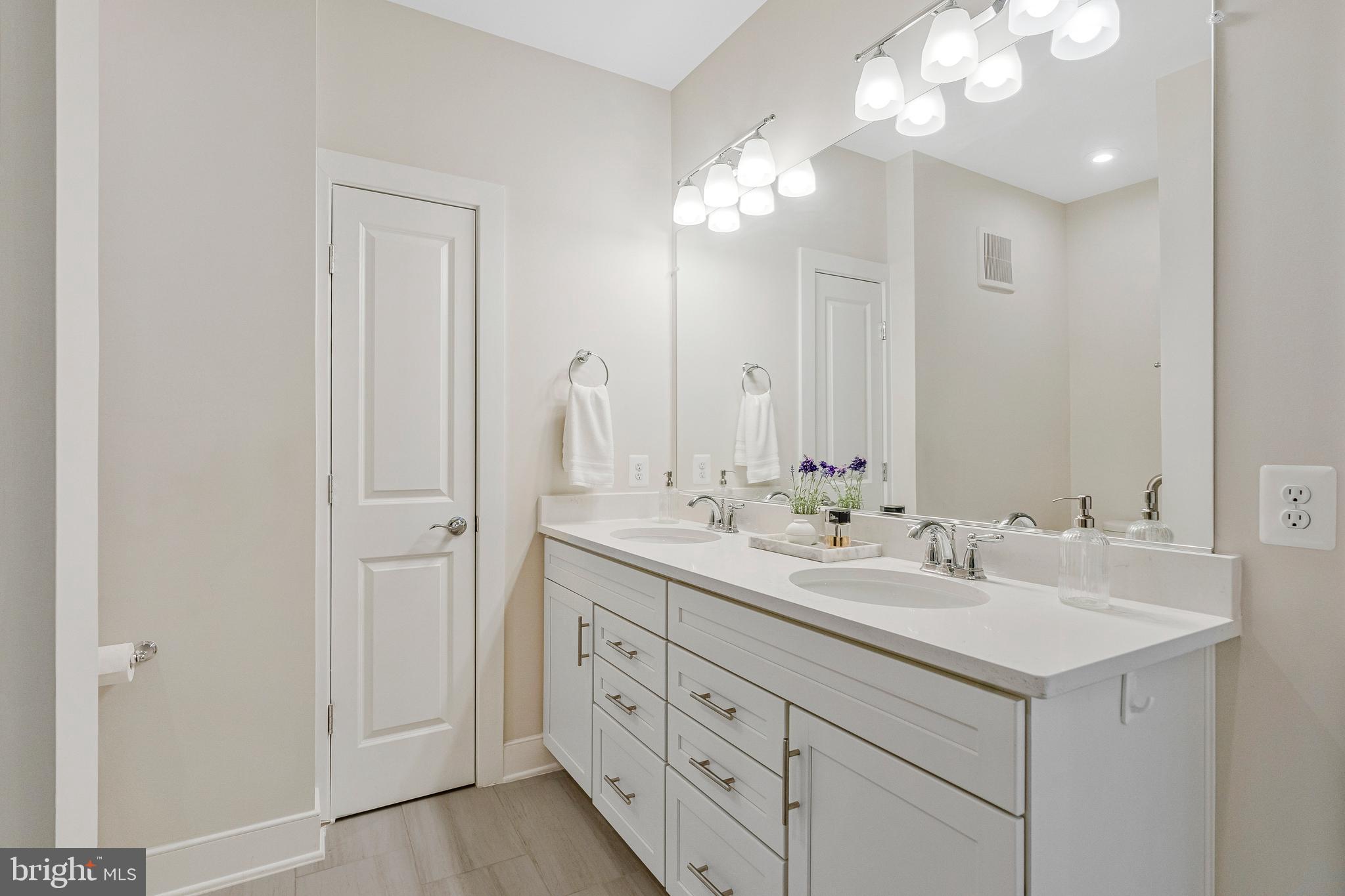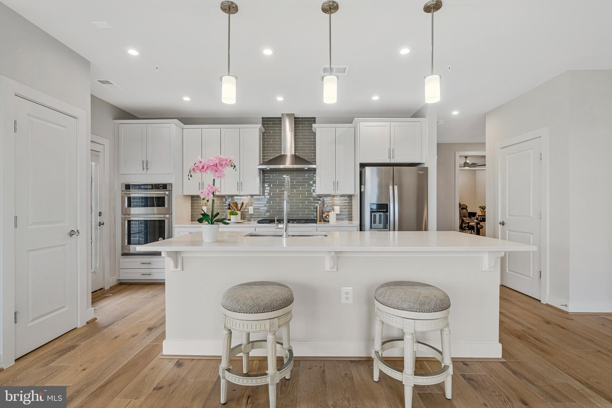 Unwind in the luxurious primary suite, complete with a generous walk-in closet and spa-like en suite featuring dual sinks, quartz countertops, and an oversized shower. The second bedroom is served by a stylish hallway bathroom featuring a classic subway tile tub/shower combination and a quartz countertop vanity, while the dedicated office with chic French doors and a closet creates an ideal work-from-home space.