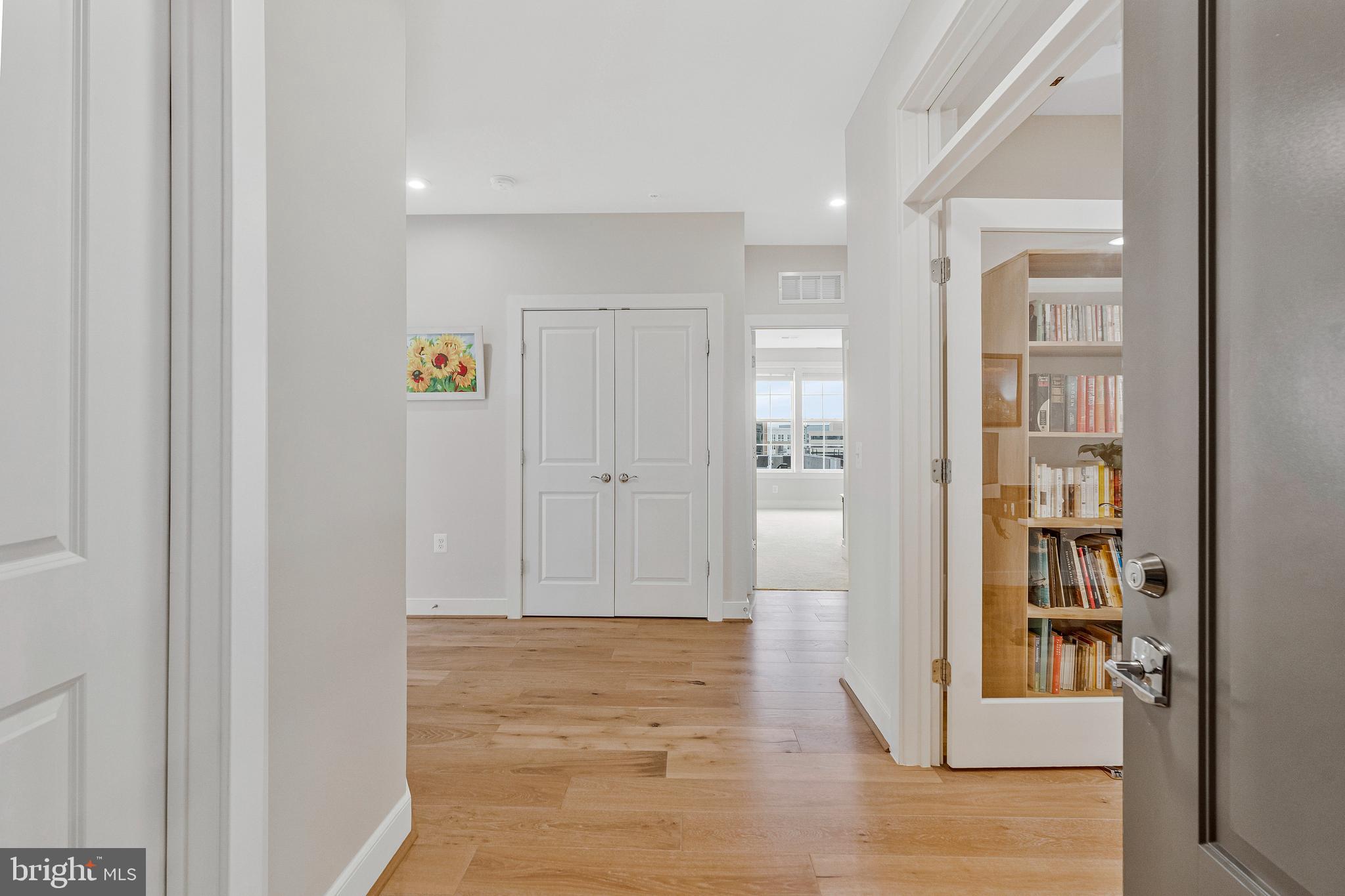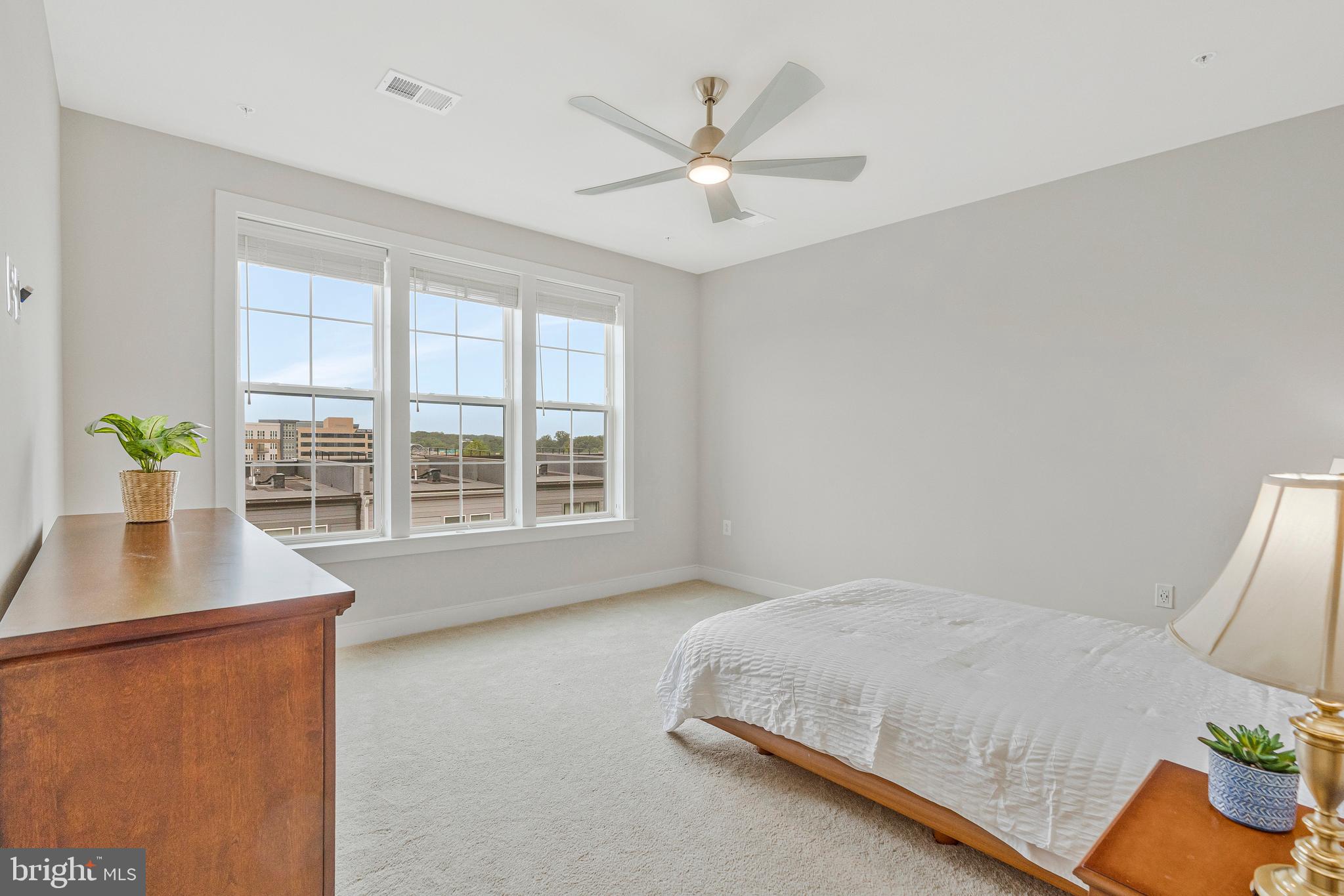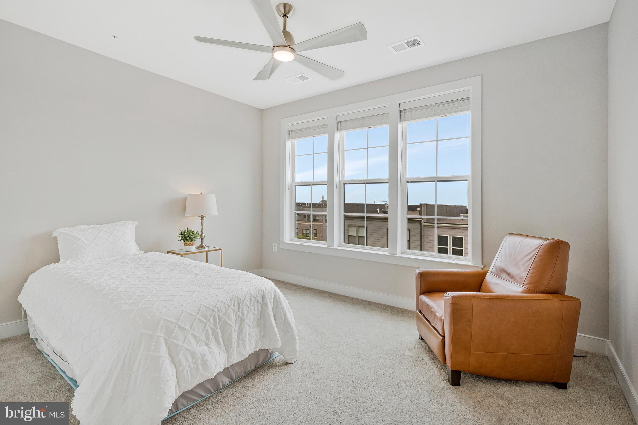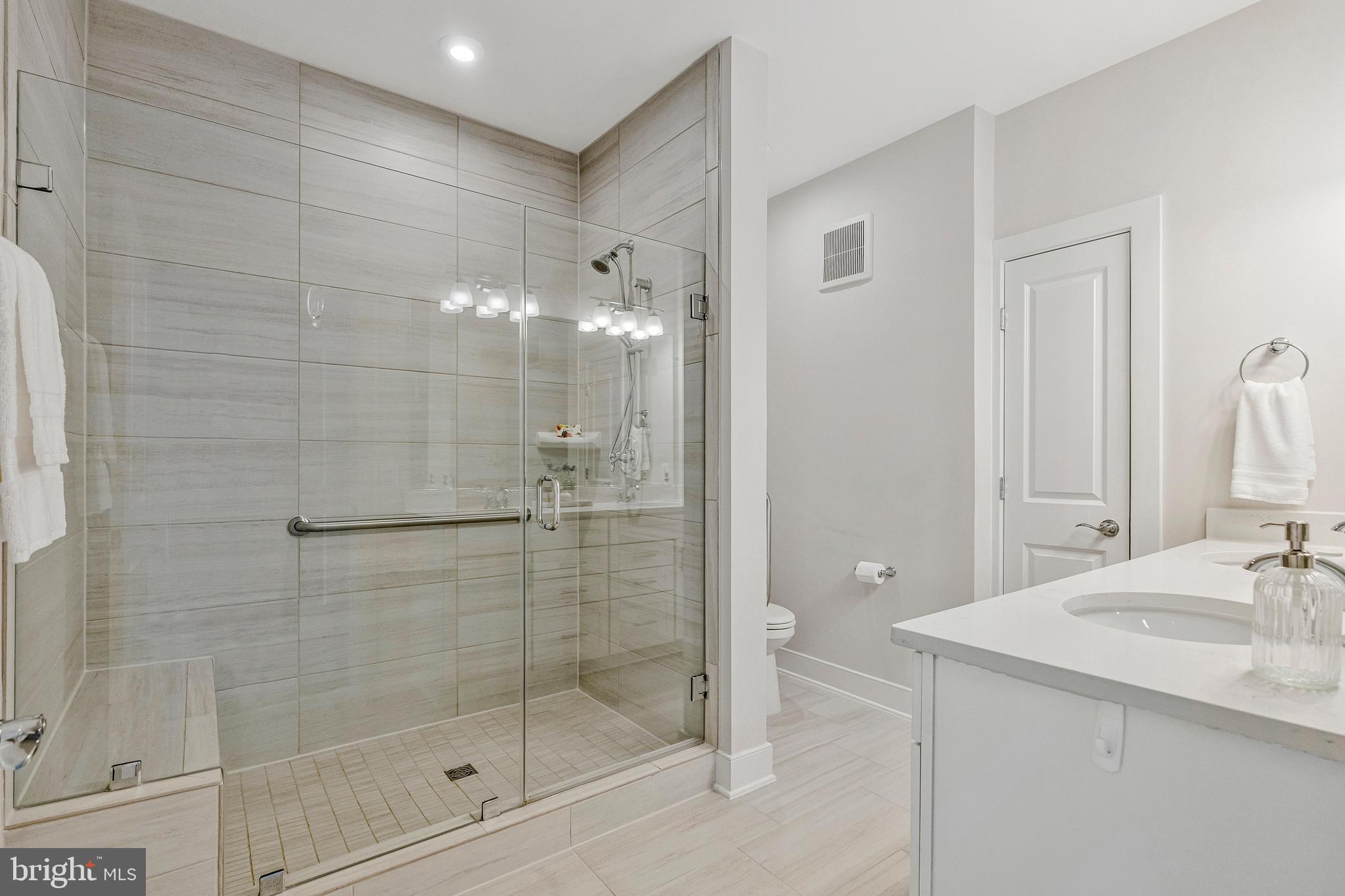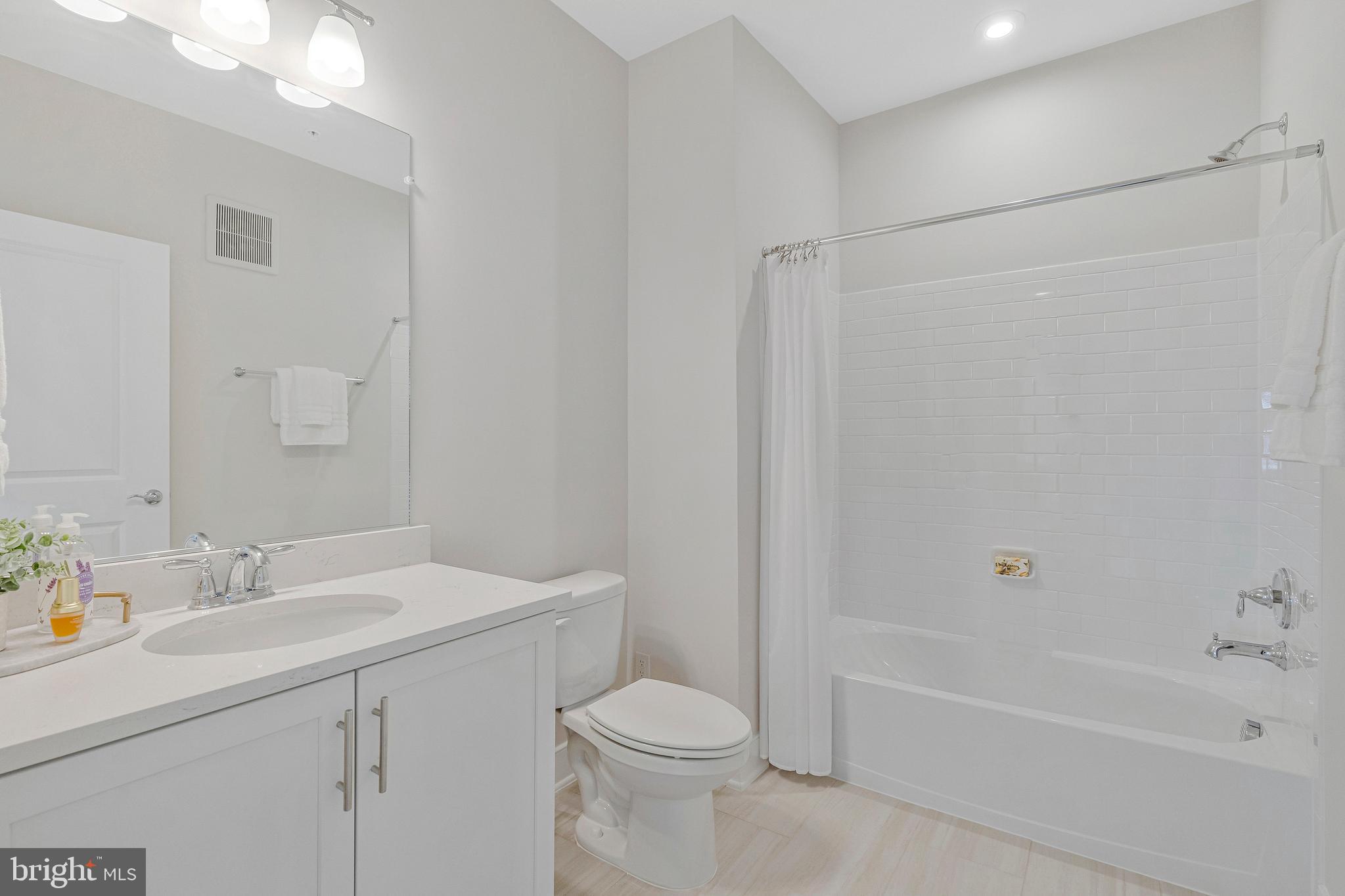 Unwind in the luxurious primary suite, complete with a generous walk-in closet and spa-like en suite featuring dual sinks, quartz countertops, and an oversized shower. The second bedroom is served by a stylish hallway bathroom featuring a classic subway tile tub/shower combination and a quartz countertop vanity, while the dedicated office with chic French doors and a closet creates an ideal work-from-home space.