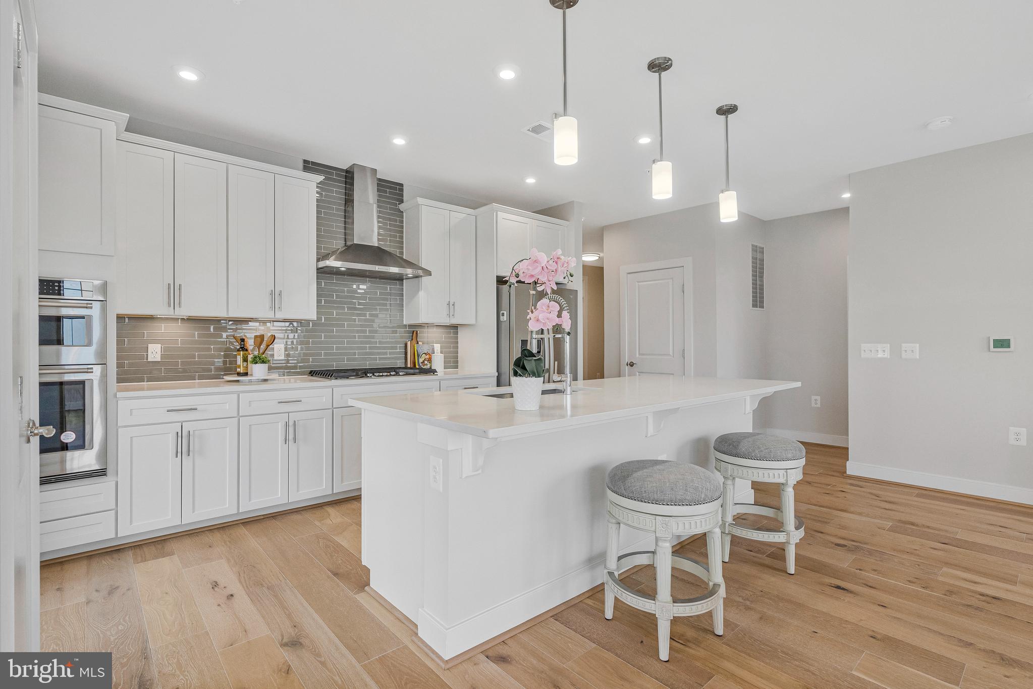 The chef's kitchen is a true centerpiece, featuring quartz countertops, high-end stainless steel appliances, a gas range with exterior venting hood, white shaker cabinetry, and a spacious breakfast bar island perfect for cooking, hosting, and connecting with loved ones.