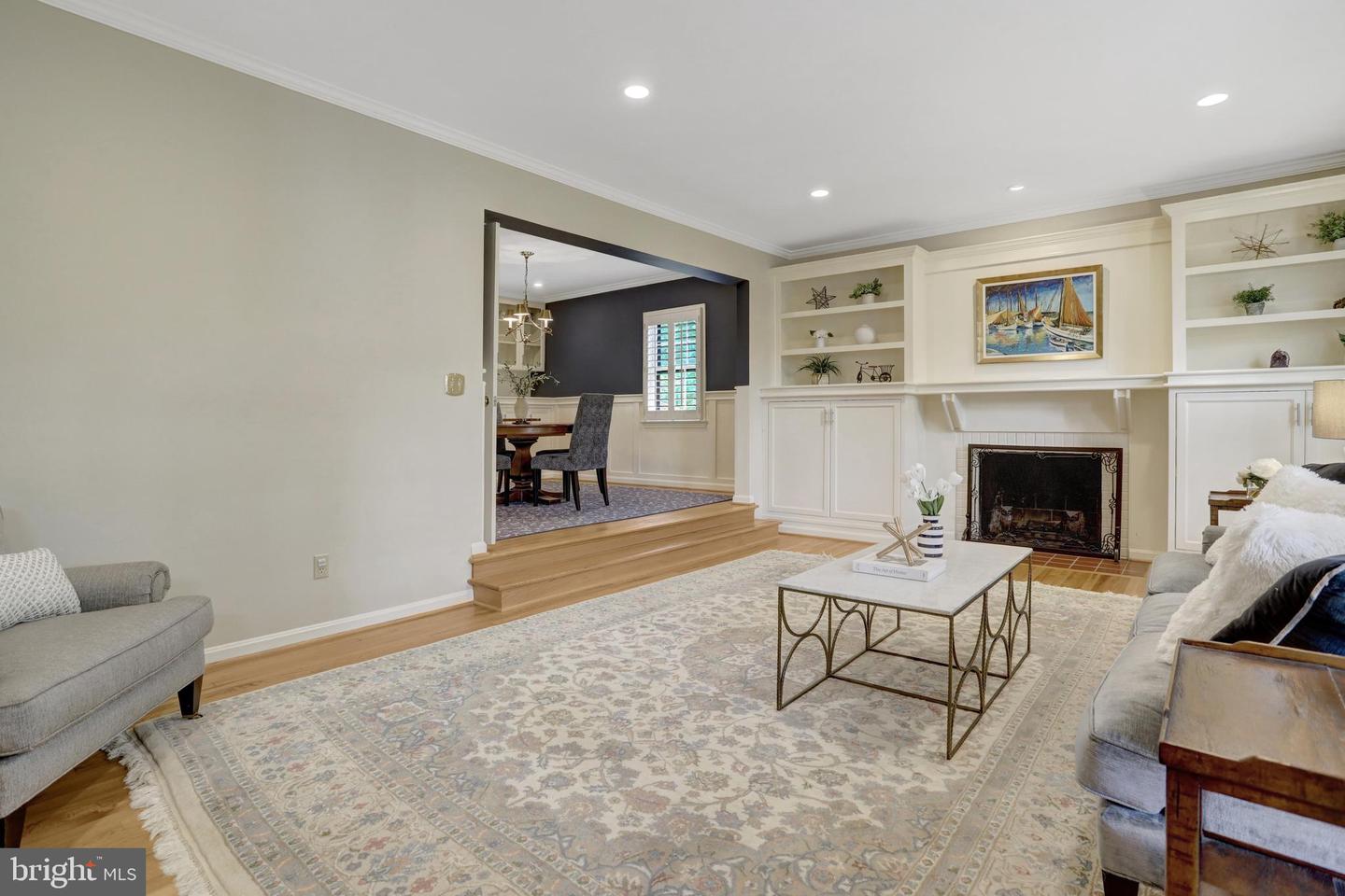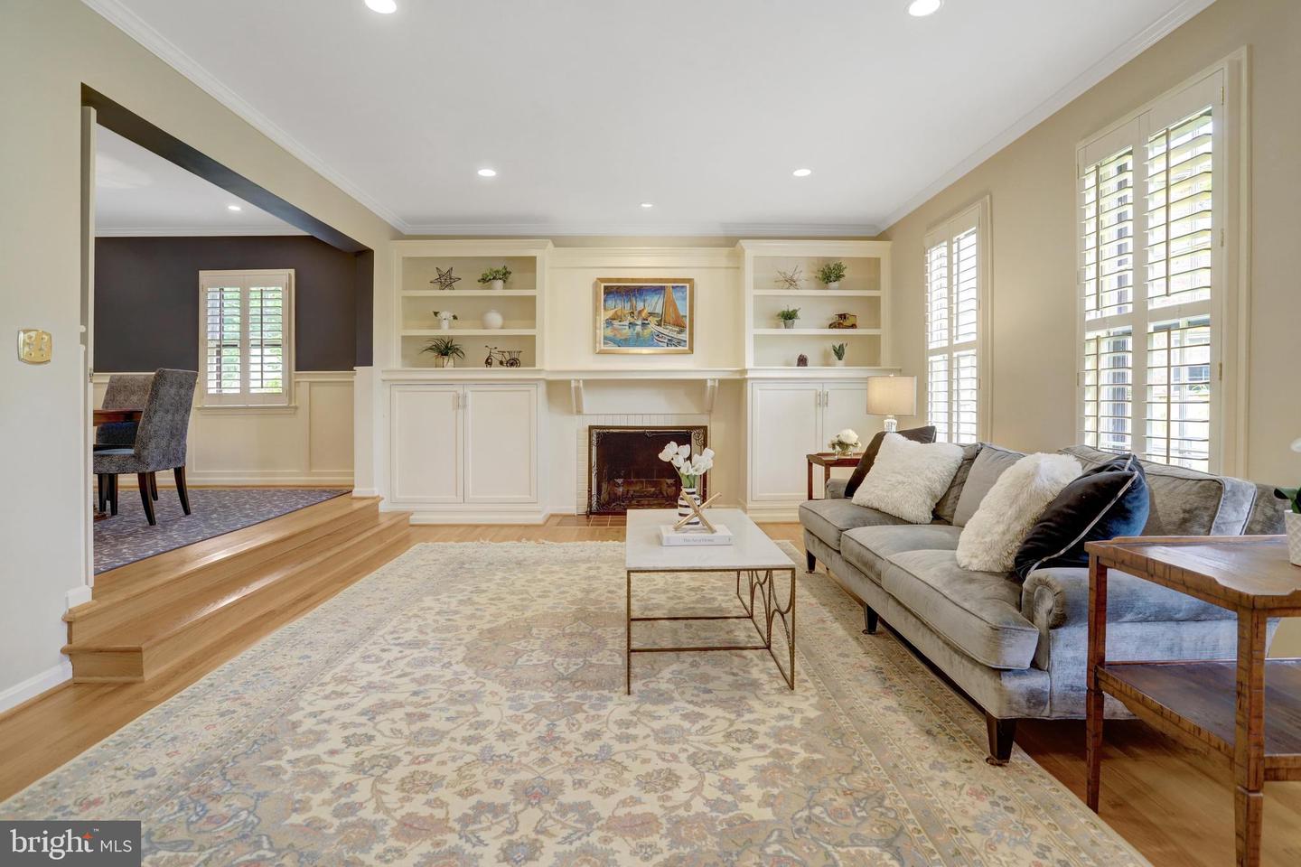 Step inside to find gleaming hardwood floors, plantation shutters, crown molding, and a spacious sunken living room centered around a cozy fireplace with custom built-ins. The formal dining room, adorned with wainscoting and stylish built-in cabinetry, is perfect for entertaining.