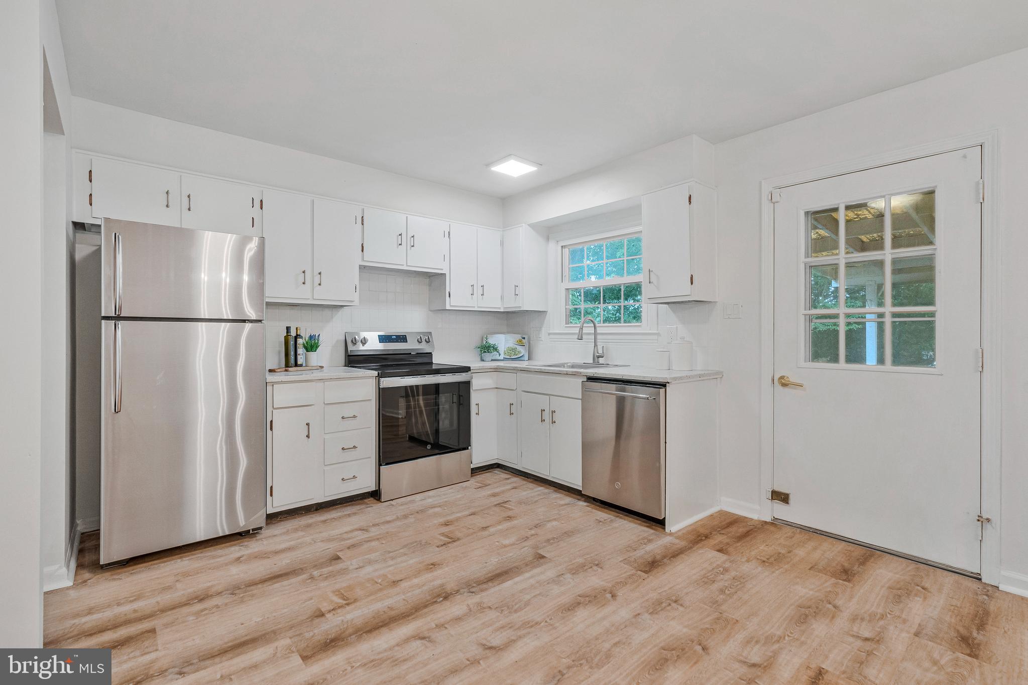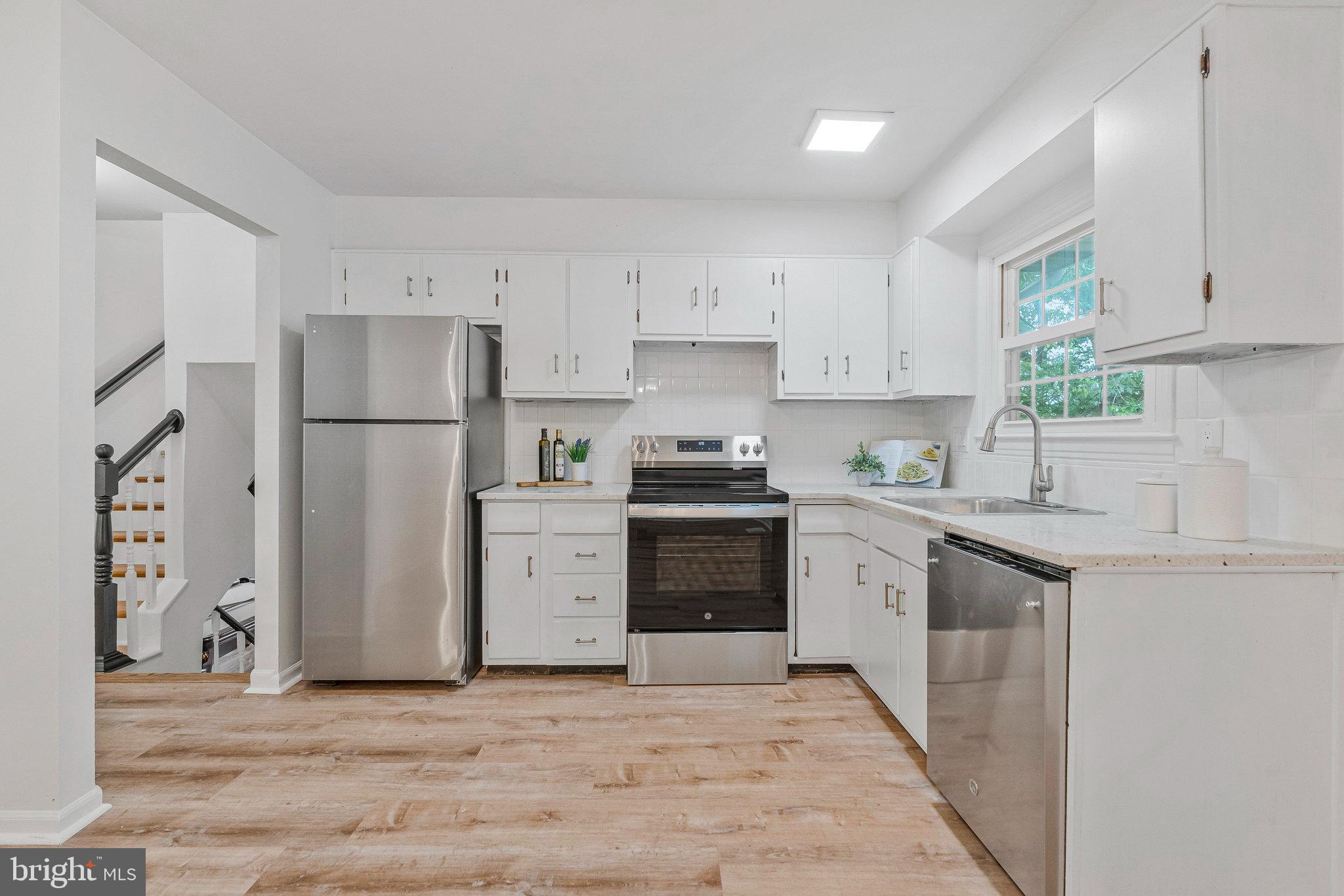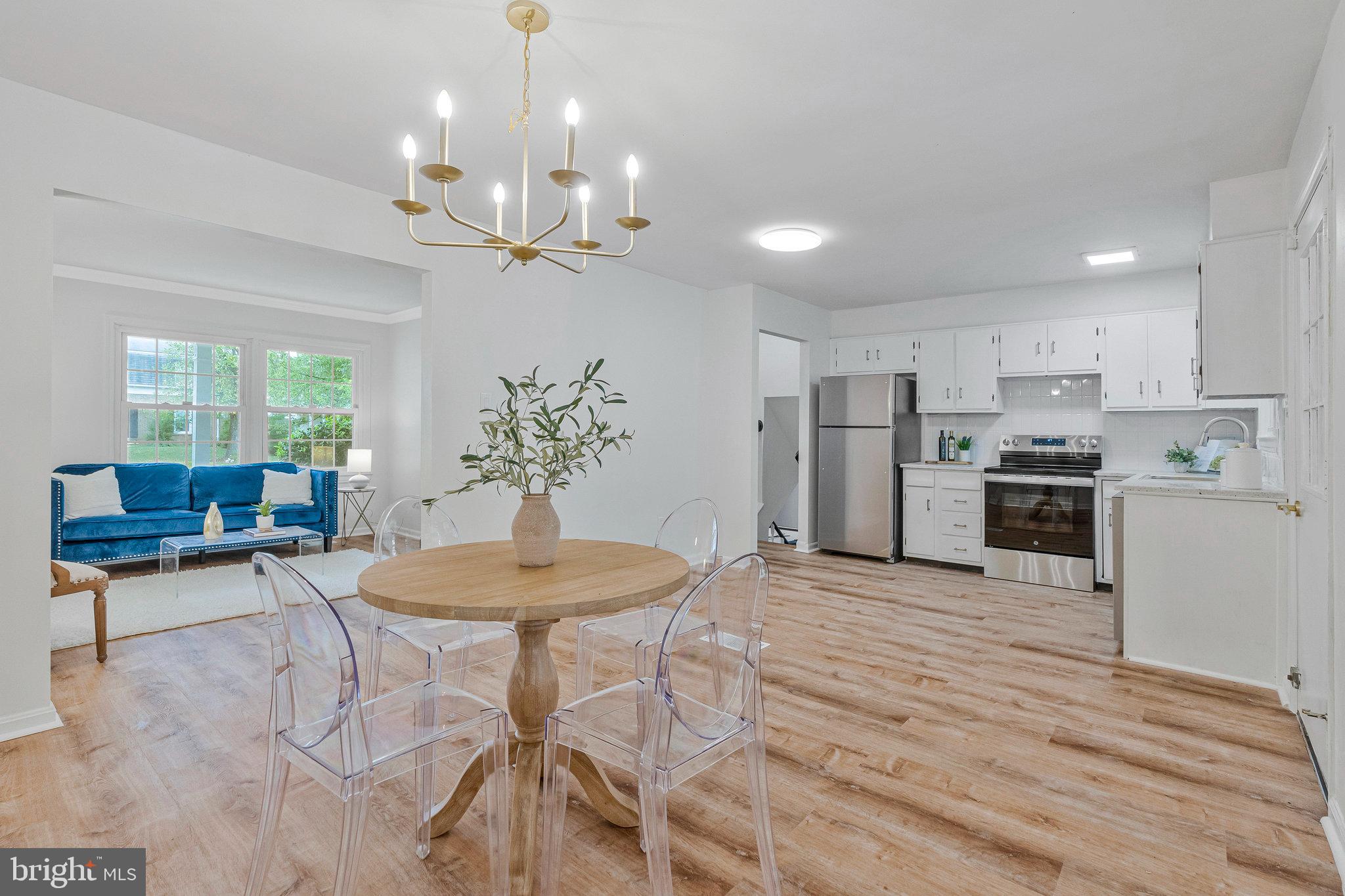 The main level offers an inviting family room with new luxury vinyl plank flooring, flowing into a refreshed kitchen with crisp white cabinetry, granite countertops, and brand-new stainless steel appliances. The open dining area is perfect for both daily living and entertaining.